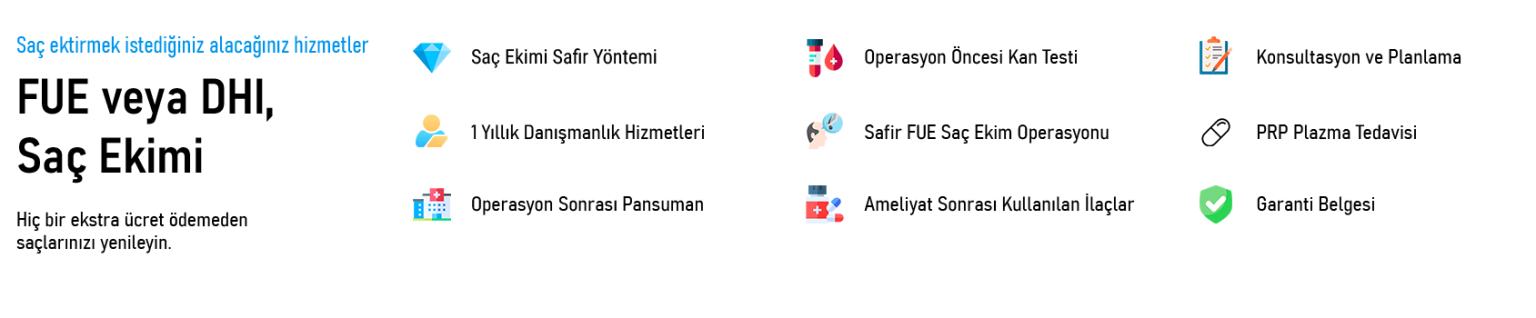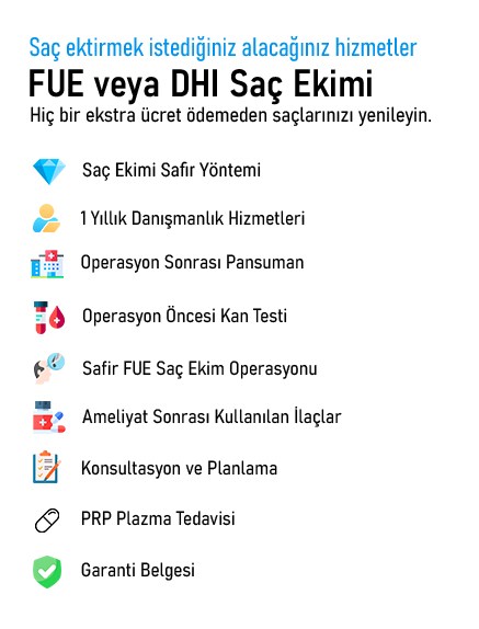 Belirtilen fiyat ile saç ekimi operasyonunuz ve sonrasında uygulanacak PRP, ameliyat sonrasında kullanacağınız ilaçlar, pansuman süreci, saç yıkaması, 1 yıl boyunca danışma dahil tam kapsamlı saç ekimi hizmeti alırsınız. Sizden hiçbir ek tedavi veya ürün masrafı alınmaz.